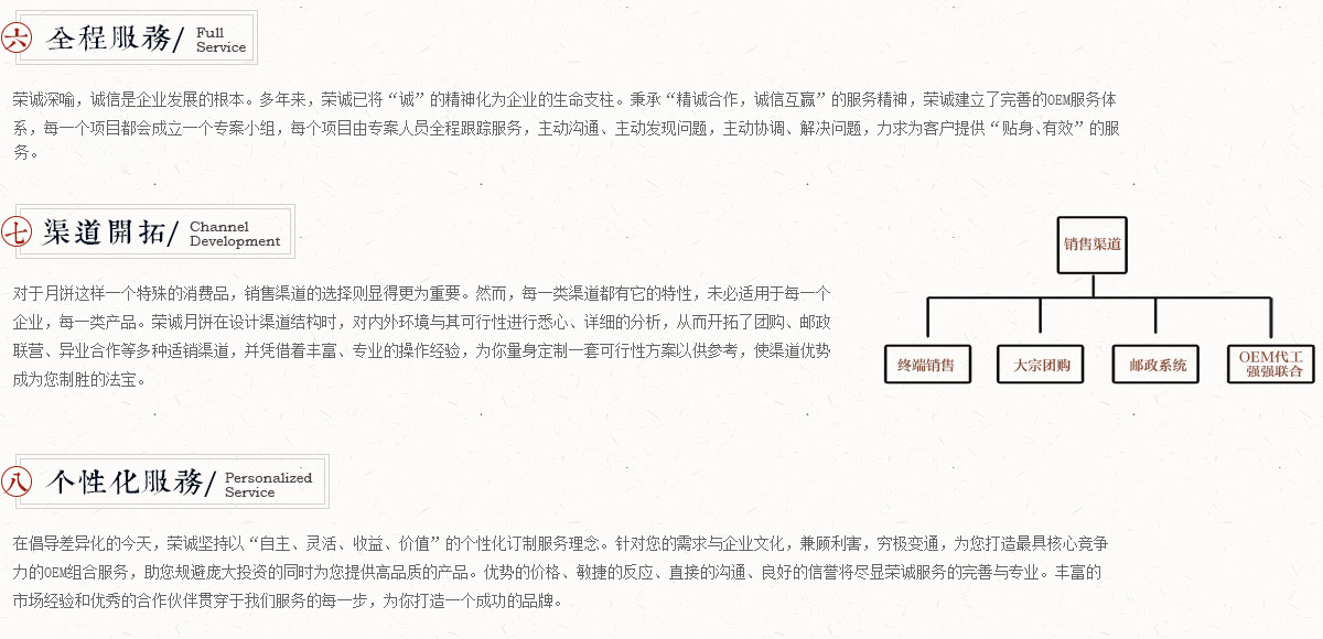 榮誠(chéng)作為一家高標(biāo)準(zhǔn)、規(guī)范化、規(guī)?;膶I(yè)烘焙生產(chǎn)企業(yè),依靠強(qiáng)大的專業(yè)能力,每年可為上千家企業(yè)提供形式靈活、創(chuàng)意時(shí)尚的個(gè)性化定制服務(wù),業(yè)務(wù)類型覆蓋:合作授權(quán)定制、酒店禮食定制、渠道創(chuàng)意定制、集團(tuán)福利個(gè)性化定制、跨界聯(lián)名定制等各式各樣的定制需求。榮誠(chéng)與多個(gè)省市的中國(guó)郵政、中國(guó)聯(lián)通等大型企業(yè)單位建立長(zhǎng)期合作,提供專屬定制禮食產(chǎn)品,接受客戶及第三方檢測(cè)機(jī)構(gòu)的專業(yè)嚴(yán)格驗(yàn)廠。在渠道端二十多年的市場(chǎng)耕耘,榮誠(chéng)與沃爾瑪、大潤(rùn)發(fā)、世紀(jì)聯(lián)華等各大連鎖KA賣場(chǎng)建立穩(wěn)定的合作,產(chǎn)品與服務(wù)獲得消費(fèi)者的廣泛認(rèn)可。