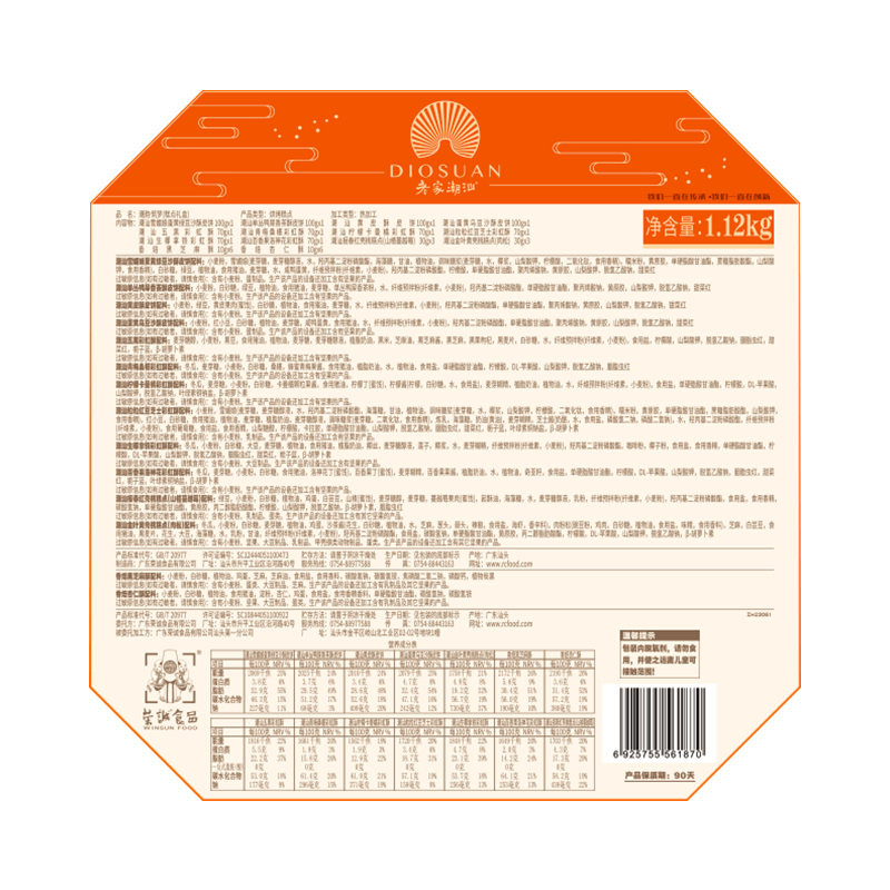 【編 碼】 YBZ2320 【條形碼】 6925755561870 【尺 寸】 25x25x21cm 【凈含量】 1120g 【規(guī) 格】 1120gx4盒/箱 【內(nèi)容物】 100g潮汕雪媚娘蛋黃綠豆沙酥皮餅x1+100g潮汕單叢鴨屎香茶酥皮餅x1+100g潮汕黃皮酥皮餅x1+100g潮汕蛋黃烏豆沙酥皮餅x1+70g潮汕五黑彩虹酥x1+70g潮汕青梅桑椹彩虹酥x1+70g潮汕檸檬卡曼橘彩虹酥x1+70g潮汕粒粒紅豆芝士彩虹酥x1+70g潮汕生椰拿鐵彩虹酥x1+70g潮汕百香果洛神花彩虹酥x1+30g潮汕報(bào)春紅殼桃糕點(diǎn)(山楂蔓越莓)x3+30g潮汕金葉黃殼桃糕點(diǎn)(肉松)x3+10g香焙黑芝麻酥x6+10g香焙杏仁酥x6