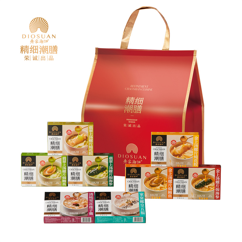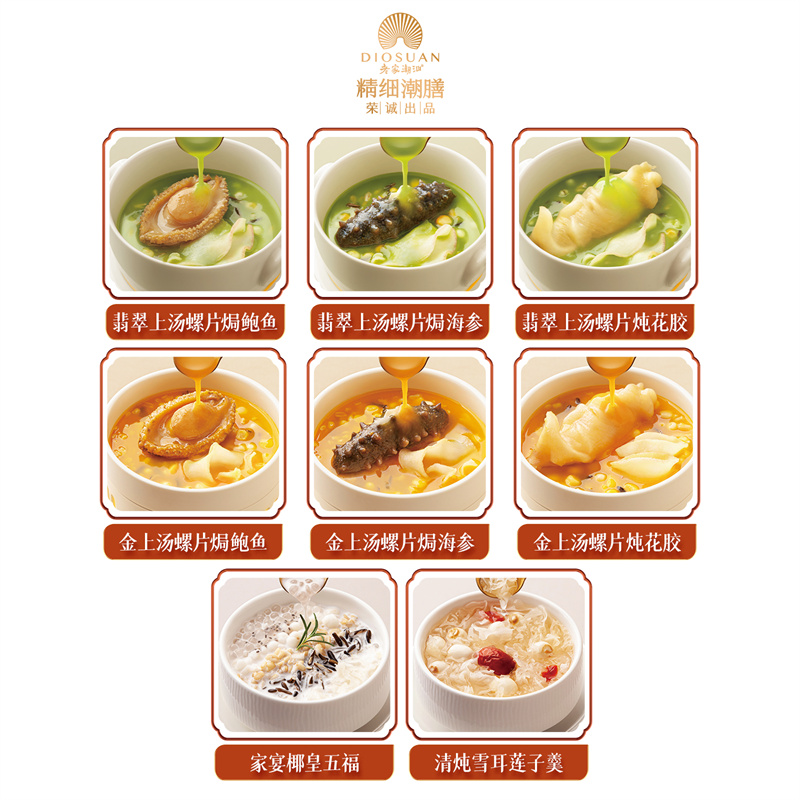 225g翡翠上湯螺片焗鮑魚(yú)x1,225g翡翠上湯螺片焗海參x1,225g翡翠上湯螺片燉花膠x1,225g金上湯螺片焗鮑魚(yú)x1,225g金上湯螺片焗海參x1,225g金上湯螺片燉花膠x1,225g家宴椰皇五福x1,225g清燉雪耳蓮子羹x1